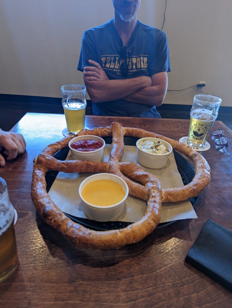 An enormous pretzel with Andy (and Wendy, who is present but not visible) at Edge of the World Brewery in Colorado City. The beer, pretzel and pizza were ALL surprisingly excellent. The excellence of the company was not a surprise.