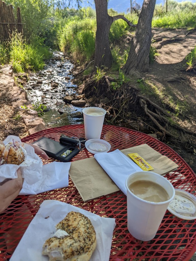 Coffee and bagels beside a babbling brook behind Taos Cow